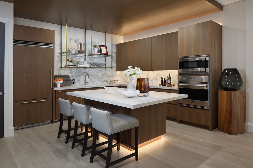 The showroom features W Design’s custom furniture line, W Home Collection amongst a curated collection of lighting, accessories, and bespoke pieces. An expansive resource room houses fabric and finish samples featuring a sliding library ladder. The kitchen boasts a sleek, streamlined design featuring custom walnut cabinetry, a suspended brass shelving unit and Calacutta Borghini backsplash.